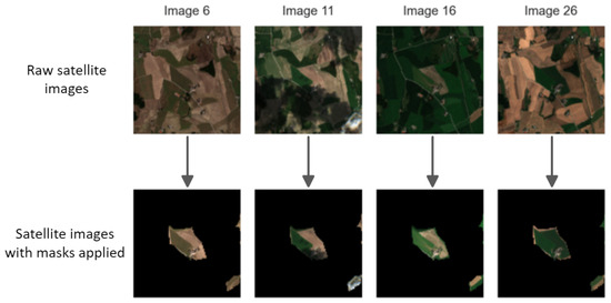 Figure 4. An example of property masking applied to four 100 × 100 satellite images of a farm spread throughout the growing season. - Extracting field boundaries from remote sensing images: For the preliminary crop classification experiment, raw satellite images were employed. During experimentation, it became evident that each satellite image encapsulates information for multiple fields within a farmer’s farmland, often featuring different crop types. Consequently, applying a single crop type label to every image proved impractical. To address this, new field-based images with dimensions of were generated, each covering a single field. To facilitate the creation of these field-based images, the latitude and longitude for each farm and field were translated to values between 0 and 100, corresponding to its central position on the raw satellite image. In cases where the field’s position extended beyond the satellite image boundaries, an offset was applied. Once the field was correctly positioned, the satellite image was cropped using a side, as illustrated in Figure 5.