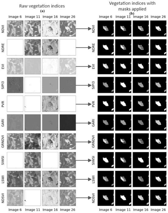 Figure 5. An example of four 16 × 16 fields throughout the growing season, created by the original satellite images in (a) and the satellite images with field masks applied in (b). Reprinted/adapted with permission from the authors Mikkel Andreas Kvande and Sigurd Løite Jacobsen, Hybrid Neural Networks with Attention-Based Multiple Instance Learning for Improved Grain Identification and Grain Yield Predictions. Masters Thesis; published by University of Agder, Grimstad, Norway, 2022 [17]. - Vegetation indices derived from satellite images: Throughout the literature reviewed in the previous Section 2.1.2, the efficacy of various vegetation indices for classifying and mapping crop types was demonstrated by several research efforts, including those by Hu et al. [15], Ma et al. [67], Wang et al. [47], and Barzin et al. [48]. These studies highlighted the utility of different vegetation indices derived from raw Sentinel images for agricultural applications. To identify suitable indices for Norwegian agriculture, a selection was made based on the findings of these research efforts.The appropriate Sentinel-2A bands for each vegetation index were determined using the wavelength information provided earlier in this manuscript, as well as studies by Kobayashi et al. [42] and Henrich et al. [26]. Subsequently, formulae were derived based on the theoretical foundations presented earlier. These formulae utilised the band numbers corresponding to the Sentinel-2A bands listed in Table 1. These calculations were performed to generate vegetation indices from every available raw satellite image, adhering to established methodologies and principles outlined in the literature.The vegetation indices were computed by extracting the relevant bands from the acquired Sentinel-2A satellite images and applying their respective formulae, as explained earlier in this manuscript. Ten vegetation indices were calculated for each of the 30 satellite images captured throughout the growing season for each farm. These indices were then stacked to form a image array. Examples of ten vegetation indices can be seen in Figure 6a, with the corresponding property masks applied that can be seen in Figure 6b. The images were normalised to a range between 0 and 1 to facilitate visualisation of the differences within the images. A greyscale representation was used as the images consist of a single channel. Blurry or blank areas in some images could be attributed to factors such as cloud cover, noise, limitations inherent to the vegetation index, or constraints in visualisation. A field-based dataset was constructed from the vegetation index images to facilitate classification using the vegetation indices, akin to the process employed for raw satellite images previously detailed in this section. Examples of two fields depicted using the NDVI, LSWI, and NDSVI vegetation indices are illustrated on the left side of Figure 7, with the corresponding field masks applied on the right side of Figure 7.