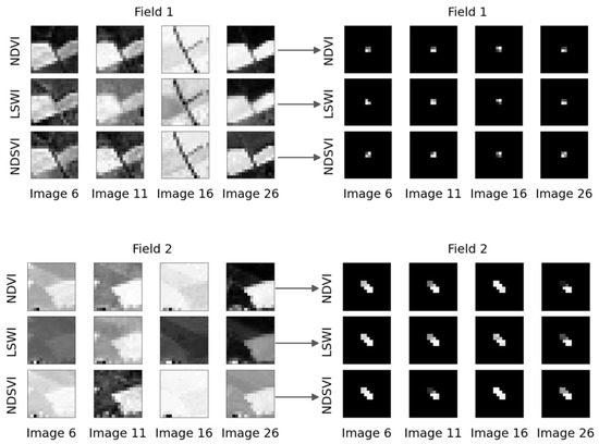 Figure 7. Left side: Two sets of 16 × 16 field images throughout the growing season, for the vegetation indices NDVI, LSWI, and NDSVI, created by the vegetation images in Figure 6. Right side: The field-based vegetation indices from the left side with field masks applied. Reprinted/adapted with permission from the authors Mikkel Andreas Kvande and Sigurd Løite Jacobsen, Hybrid Neural Networks with Attention-Based Multiple Instance Learning for Improved Grain Identification and Grain Yield Predictions. Masters Thesis; published by University of Agder, Grimstad, Norway, 2022 [17].