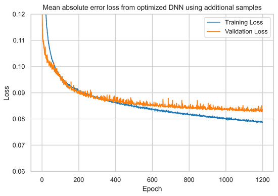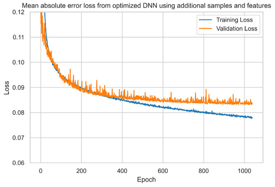 Figure 9. Yield prediction loss achieved from the optimised model when adding more data to the corpus. - Integration of features and data corpus to dense neural network: Following the integration of the dataset with additional weather features and data samples, as previously detailed, a further 600 features and approximately 15,000 samples were incorporated. The optimised dense neural network (DNN) model, adapted to accommodate the expanded input shape, underwent 1200 training epochs. As a consequence, the mean absolute error (MAE) value exhibited a marginal decrease of approximately 0.7 kg per 1000 m2, which resulted in a value of 82.60 kg per 1000 m2; see Table 2 and Figure 10. Furthermore, a minor increase in training time of approximately 5 to 6 min was observed, attributed to the enlarged data corpus.