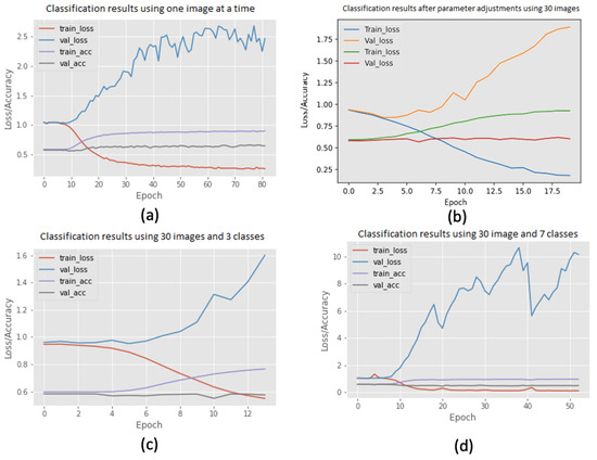 Figure 12. Graphs showing results from different approaches on farm-scale grain classification.Moreover, the validation accuracy predominantly remains constant, even after training for 80 epochs, and in most cases, the validation loss experiences an increase. The distinct models underwent varying amounts of processing time as each experiment manifested a consistent negative trend; see Figure 12. The graphical representations illustrate that the validation accuracy consistently hovers around 0.6 for all implemented models. The initial random image model achieved its highest training accuracy at 0.8; however, acknowledging its tendency for overfitting, the authors decided to explore the field-based grain classification to enhance target analysis. - Field-based grain classification: The field-based crop classification model categorises crop types based on time-series images of individual fields rather than the entire farm. This approach offers the advantage of reduced noise in the images, leading to a faster training process. The creation of field-based images is detailed earlier in this manuscript. These images have dimensions of , sufficiently large to encompass even the most extensive fields while remaining significantly smaller than the original size. The fields with the smallest areas were excluded from consideration, as these would cover only one or two pixels in the satellite images, providing minimal data for the network. This exclusionary criterion was applied to all subsequent experiments related to field-based crop classification. Moreover, the satellite images underwent augmentation techniques such as salt and pepper, rotation, and random flips. Augmentation was incorporated due to its efficacy in mitigating overfitting in machine learning models. Subsequently, the images were integrated into a TensorFlow Generator and inputted into the model. During the reconstruction of the model for field-based images in this experiment, inspiration was drawn from a study by Ferlet (https://medium.com/smileinnovation/training-neural-network-with-image-sequence-an-example-with-video-as-input-c3407f7a0b0f (accessed on 6 May 2024)) to further enhance model performance. Additionally, the successful 2D CNN implementation with multiple sets of CNN, max-pooling, and ReLU by Kussul et al. [12] was evaluated. The researchers achieved a crop type classification accuracy of 94.6%. Therefore, their architectural structure and functions were considered and evaluated for application in this experiment.