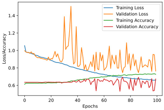 This model, characterised by several layers and neurons, prompted the selective incorporation of pertinent network layers tailored to the agricultural data to mitigate overfitting. Resembling the farm-based model, this model diverges in the time-distributed part, featuring additional parameters like moving mean and variance, beta, and gamma inherited from the batch normalisation layers in the CNN net. Additionally, an extra dense layer, encompassing a dropout layer, is introduced post-GRU, with these dense layers being smaller than their farm-based counterparts. Notably, the GRU layer’s size is reduced to 12 units from 64 units, impacting its effectiveness in preventing overfitting. Figure 13 illustrates the outcomes of training the optimised field-based crop classification model, revealing a decline in loss and increase in accuracy for both training and validation sets—a discernible improvement compared to the farm-scale model. At its best, this model achieved a validation accuracy of 70%, representing a 10% enhancement over farm-scale classification. These findings substantiate that smaller, less noisy images are more conducive to accurate crop classification. Moreover, fluctuations in validation loss and accuracy after 20 to 30 epochs are observed, a topic to be addressed in subsequent sections. Additionally, a possibility for overfitting is noted in most crop classification results, a phenomenon recurrently identified due to data distribution, particularly in datasets featuring satellite images.