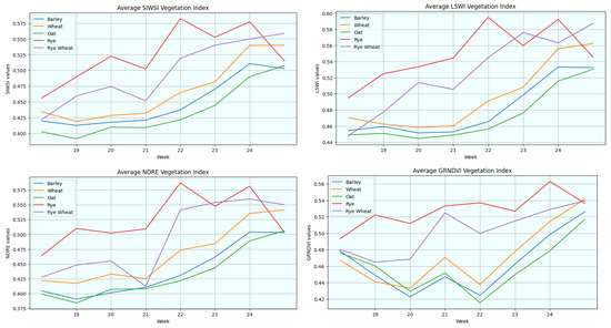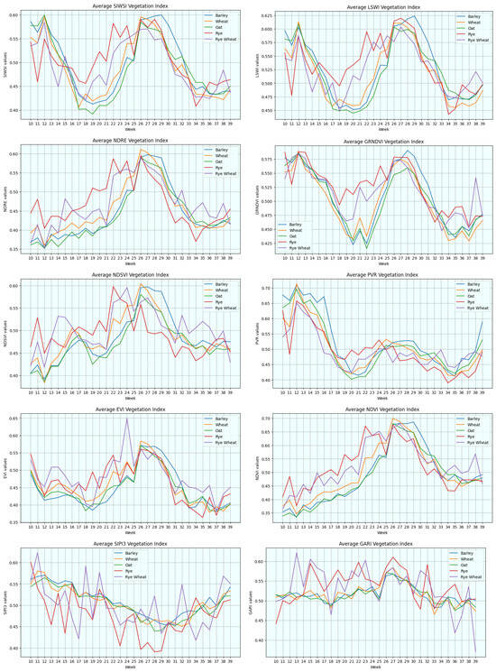 - Employing vegetation indices for crop categorisation: Remote sensing techniques, which analyse the spectral composition of Earth’s surface, elucidate land, water, and vegetation features. Vegetation indices, derived from multiple spectral bands, convert reflective data into metrics that elucidate vegetation characteristics and terrestrial changes. These indices, essential in remote sensing analyses, necessitate careful selection to suit specific objectives in varied environments, especially in grain type differentiation, where variations are more nuanced [15]. This study utilises a suite of ten vegetation indices, thoughtfully chosen to optimise accuracy in cereal type categorisation.