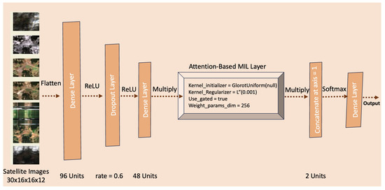 - Attention-based multiple-instance learning: In image classification research endeavours, datasets typically possess consistent labelling corresponding to their respective classes. However, this conformity is often lacking in real-world applications, as evidenced in medical imaging studies where multiple images may need more specific class labels, providing only generalised statements regarding their categorisation. Similarly, in agricultural contexts, the labelling of crops for each field needs to be completed, resulting in a semi-labelled dataset. Multiple-instance learning (MIL) has emerged as a thoroughly investigated semi-supervised learning method [59,60,61] to mitigate this challenge. MIL aims to predict the labels of bags, where bags comprise a mixture of labelled and unlabelled instances, departing from the conventional approach of classifying individual instances. In a traditional MIL framework, a single target class is specified, and bags are labelled as positive or negative depending on the presence or absence of at least one instance of the target class. Consequently, comprehensive knowledge of instance labels becomes unnecessary, thereby enhancing the suitability of MIL in scenarios with partially labelled data [60,62]. Notably, MIL models incorporate an attention mechanism that assigns an attention score to each instance within a bag, indicating its influence on bag classification. These scores are calculated using the softmax function, ensuring their collective summation to unity.Prior research has explored various approaches to bag classification. Cheplygina et al. [63] introduced bag dissimilarity vectors as features in the training dataset, representing each bag’s dissimilarity. Chen et al. [64] leveraged instance similarities within bags to construct a feature space, extracting crucial features for traditional supervised learning. Raykar et al. [65] investigated diverse instance-level classification techniques and feature selection methods within bags, yielding promising and competitive outcomes.