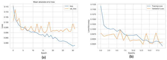 - Weather features to dense neural network: The authors enhance the utilised data by introducing three novel features—sunlight duration, state of the ground, and growth degree—into the training dataset. These additional features are integrated with farmer organisation numbers, expanding the feature count from 900 to approximately 1500. The authors subsequently re-implement the dense neural network (DNN), where the authors observed the initial signs of overfitting. Consequently, the model is adjusted by reducing the size of the first dense layer to 256 and marginally increasing the dropout percentages to 0.25 and 0.5, respectively. As illustrated in Figure 8b, a noticeably diminished disparity between training loss and validation loss is evident compared to Figure 8a, signifying mitigation of overfitting. The mean absolute errors (MAEs), measured in kg per 1000 m2 for the baseline and the newly proposed optimised models, stand at 83.85 kg per 1000 m2 and 83.28 kg per 1000 m2, respectively; see Table 2 and Figure 8. As a result, the authors opt to employ this newly proposed and optimised DNN model for subsequent experiments.