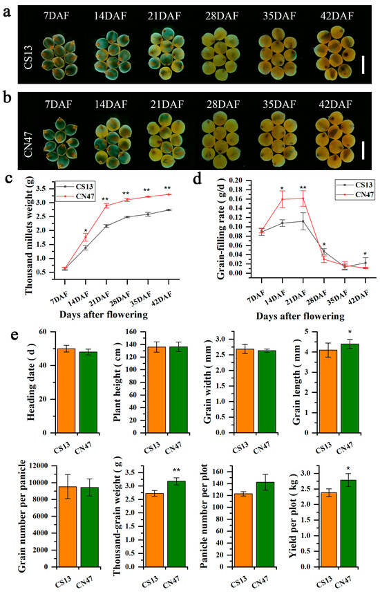 Phenotypic changes related to grain filling rate in foxtail millets (a,b) Morphological changes in foxtail millet grains of CS13 (a) and CN47 (b) at six stages. Bars = 500 μm. (c) Changes in thousand millets weights (de-husked grains) of CS13 and CN47 at six stages. (d) GFR changes of CS13 and CN47 at six stages. (e) Comparison of the agronomic traits between CS13 and CN47. Values are presented as means ± SD (n = 3). Significance was assessed using the t-test (*, p ≤ 0.05 and **, p ≤ 0.01).