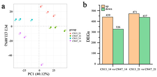 The transcriptome analysis and the total number of differentially expressed genes of the two foxtail millets at two stages during grain filling. (a) The principal component analysis (PCA) plot analysis of transcriptomes; the x-axis shows principal component 1 (PC1) and the Y-axis shows principal component 2 (PC2). S1–S3, S4–S6, N1–N3, and N4–N6 represent the three biological replicates, corresponding to 14 DAF of CS13, 21 DAF of CS13, 14 DAF of CN47, and 21 DAF of CN47. (b) The statistics of expressed genes (DEGs) in the CS13_14 vs. CN47_14 and CS13_21 vs. CN47_21 comparison.