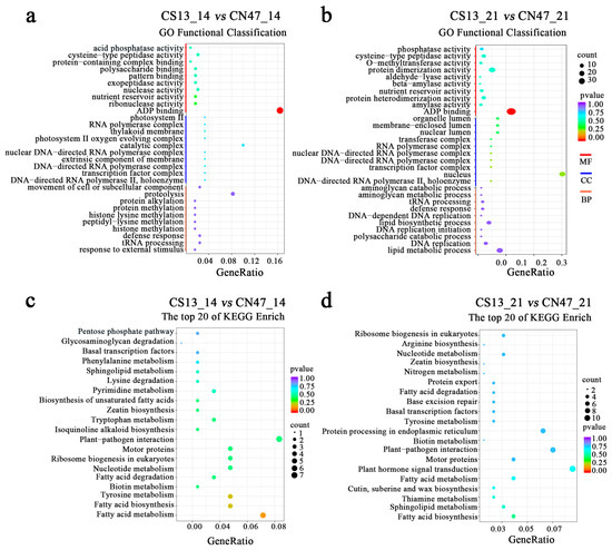 (a,b)—The top 25 GO classifications in each category of DEGs in the CS13_14 vs. CN47_14 and CS13_21 vs. CN47_21 comparisons of foxtail millet. (c,d)—The top 20 KEGG classifications in each category of DEGs in the CS13_14 vs. CN47_14 and CS13_21 vs. CN47_21 comparisons of foxtail millet. |log2(fold change)| ≥ 1 and p-value < 0.05 were used as screening criteria of DEGs.