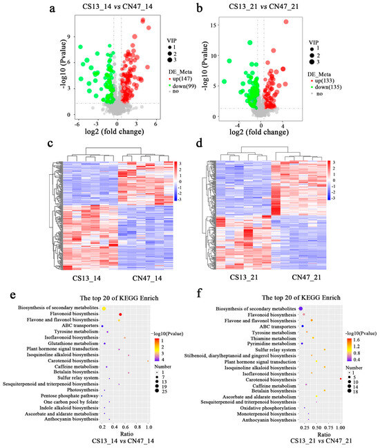 The metabolomic profiling analysis at two stages during grain filling of the two foxtail millets. (a,b)—A volcano plot of DAMs in the CS13_14 vs. CN47_14 and CS13_21 vs. CN47_21 comparisons, respectively. (c,d)—A heatmap analysis of DAMs in the CS13_14 vs. CN47_14 and CS13_21 vs. CN47_21 comparisons, respectively; red means high-level and blue means low-level. (e,f)—The top 20 KEGG pathway classifications of DAMs in the CS13_14 vs. CN47_14 and CS13_21 vs. CN47_21 comparisons, respectively.