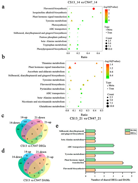 Co-mapped pathways of DAMs and DEGs at two stages during grain filling of the two foxtail millets. (a,b)—The KEGG pathway analyses of the simultaneous annotations of DAMs and DEGs in the CS13_14 vs. CN47_14 and CS13_21 vs. CN47_21 comparisons, respectively. (c,d)—The Venn diagrams of DEGs and DAMs in the CS13_14 vs. CN47_14 and CS13_21 vs. CN47_21 comparisons, respectively. (e)—The number of shared DAMs and DEGs related to co-mapped pathways. |Cor| > 0.8 and p ≤ 0.05 were used as screening criteria on the co-enrichment pathway of DEGs-DAMs.