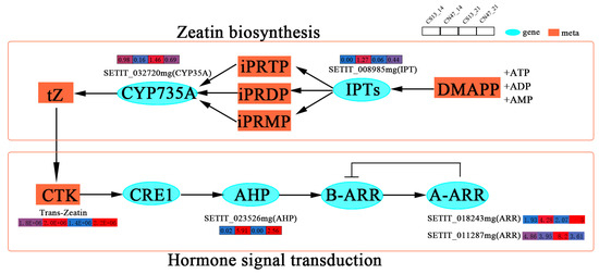 Cytokinin (CTK), an important phytohormone, plays a significant role in grain development [51]. The CTK biosynthesis (Zeatin metabolism) and signal transduction pathway exhibited enrichment of several genes during the grain filling stages at 14 DAF and 21 DAF, as depicted in Figure 7. Furthermore, a network was established to illustrate the correlation between CTK and plant growth and development. It is noteworthy that the Zeatin metabolism pathway plays an important role in the production of CTK. Its genes include a prenyltransferase (SETIT_008985mg) and a cytochrome monooxygenase (SETIT_032720mg), which, respectively, encode the IPTs protein and the CYP735A protein associated with zeatin metabolism. These enzymes act as rate-limiting enzymes for CTK biosynthesis. The expression level of SETIT_008985mg was higher at the 14 DAF and 21 DAF stages in CN47, while the CTK contents were also higher in CN47 compared to CN13 at these developmental stages. This suggests that SETIT_008985mg may be positively correlated with the GFR of foxtail millet. Additionally, we identified three key genes involved in the CTK signal transduction pathway at the 14 DAF and 21 DAF stages. These genes consisted of SETIT_023526mg, SETIT_018243mg, and SETIT_011287mg. Specifically, SETIT_023526mg was shown to encode the AHPs protein, which facilitates the transfer of phosphate groups to response regulators (SETIT_018243mg, SETIT_011287mg), thereby inducing gene expression and regulating plant growth and development. This gene exhibited high expression levels in CN47 at the 14 DAF and 21 DAF stages, suggesting a potential positive correlation with foxtail millet’s GFR. Additionally, SETIT_018243mg and SETIT_011287mg, as members of the type-A (ARR) family of response regulators, displayed distinct expression patterns between CN47 and CS13 during the 14 DAF and 21 DAF stages. These three genes collectively functioned as rate-limiting enzymes for CTK signal transduction. In addition, this study identified SETIT_029213mg and SETIT_009909mg, which are associated with the ethylene-insensitive 3 (EIN3)-like 1 (EIL1) protein and EIN3-like 5 (EIL5) protein, respectively (Figure S2). These genes exhibited high expression levels in CN47 during the 21 DAF stage, suggesting that they may have a positive correlation with GFR.