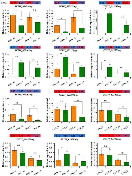 Quantitative real-time PCR (qRT-PCR) validation and RNA-seq data of 12 selected DEGs. Significance was assessed using the t-test (*, p ≤ 0.05 and **, p ≤ 0.01, ns, p > 0.05).
