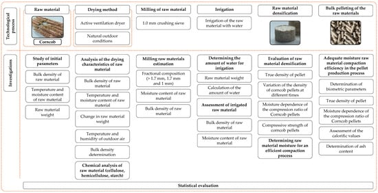 A review of existing studies shows that there is an acute lack of comprehensive information on the preparation of corncobs for densification and their biometric parameters, and there is still great uncertainty in estimating the moisture content of the raw material before densification. Therefore, the main focus of this study is on the production of pellets from corncobs: evaluating the characteristics of the corncob drying process; the effect of drying on the parameters of the chemical composition; milling efficiency in evaluating fraction composition; compaction capabilities and resistance to compression; determining the most adequate moisture parameters in the raw material; verifying the efficiency of adequate moisture compaction of the raw material in the pellet production process; and determining their biometric properties, mechanical durability, calorific value parameters, and ash content. The aim of our research is, therefore, to evaluate the preparation of corncob and the physical–mechanical parameters of the compacted raw material by determining the moisture content of the adequate raw material for pellet densification and to verify the efficiency of compaction of the raw material at the adequate moisture content in the process of pellet production, by determining its biometric properties, mechanical durability, calorific value parameters, and ash content. It is hoped that this research will be useful for the future use of corncob as an alternative energy source. Knowing the nuances of the preparation and the adequate moisture content of the feedstock during densification, as well as further research, can lead to improvements in biofuel preparation technologies, increasing efficiency and reducing production costs and environmental impact.