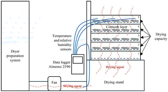 Active ventilation drying includes a special drying system, which prepares a drying agent at the required temperature and humidity in a drying stand (Figure 2). The drying system consists of an air flow conditioning system and a conditioning air reservoir, i.e., a collector. The conditioned air flow is fed by a fan into the drying stand. At the bottom of the drying stand, there is a layer of tiny stones to distribute the drying agent evenly throughout the drying area. The drying area consists of 5 wooden boxes with a mesh bottom (plastic mesh 2 mm × 2 mm) in which the corncob is spread in a single layer. The size of the wooden boxes is 850 mm × 766 mm × 92 mm (internal dimensions). The drying parameters (temperature and humidity) were measured with temperature and humidity sensors Almemo Normal FH A64S-21 (Ahlborn Almemo, Holzkirchen, Germany) at the dryer input and in the corncob layer. Drying parameters were recorded every 10 min and stored in an Almemo 2590 data logger (Ahlborn Almemo, Holzkirchen, Germany).