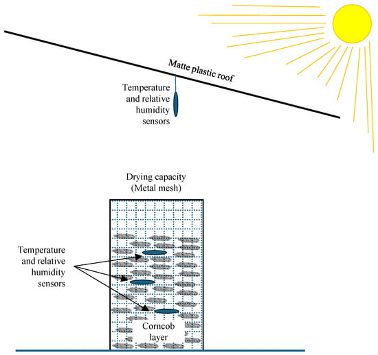For natural drying, the stand was specially prepared for outdoor conditions and protected from precipitation by a frosted plastic roof (Figure 3). A cylindrical stand was made from a metal grid (14 mm × 8 mm). The stand has a diameter of 420 mm and a height of 1000 mm. Temperature and humidity were measured under the roof and in the loosely packed corncob layer. Wireless MicroLite USB data logger temperature and humidity sensors (MicroLite USB data loggers/Fourtec—Fourier Technologies, Rosh HaAyin, Israel) were used to monitor temperature and humidity. Drying parameters were recorded every 10 min.