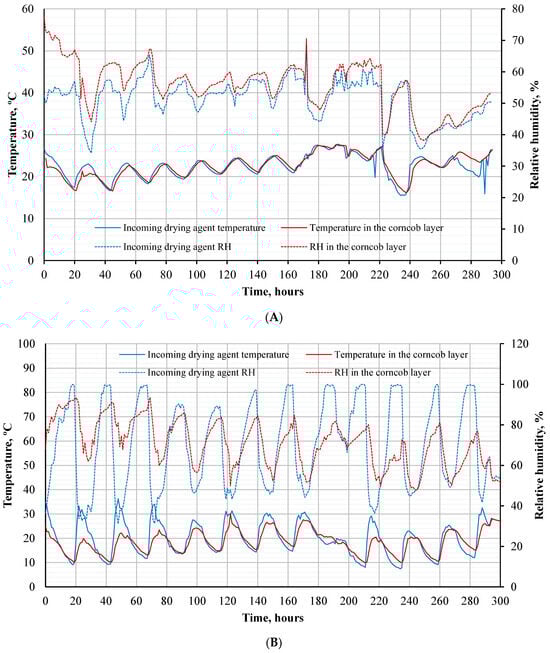 The main objective of this study was to determine the drying dynamics of corncob under different drying conditions, i.e., drying in active ventilation (Figure 4A) and drying in outdoor conditions (Figure 4B). The average daily drying parameters were not the same as expected in the active ventilation drying but showed a lower temperature variation than in the outdoor drying because the drying process was conducted using outdoor air, and the air prepared inside the conditioning system was provided to the drying box. The average temperature variation of the prepared drying agent supplied during the drying period ranged from 15.48 to 27.70 °C (RH—34.20–69.10%). The average comparative air flow rate of the dryer was about 3560 m3·(t·h)−1. The outdoor weather had average temperature variations of 7.39–36.23 °C (RH—47.77–93.57%) throughout the drying period.