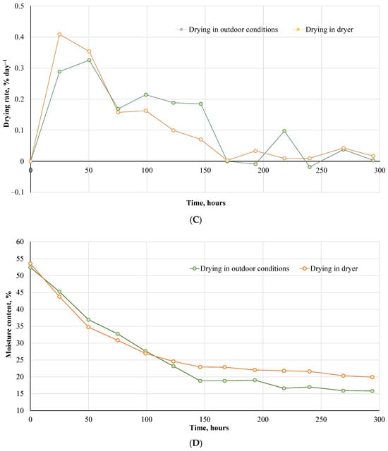 Corncob drying characteristics: (A) drying in active ventilation; (B) drying in outdoor conditions; (C) dependence of raw material drying rate on drying time in an active ventilation dryer and outdoor conditions; (D) dependence of raw material moisture content on drying time in active ventilation and outdoor conditions. Results are presented as mean value (n = 3).