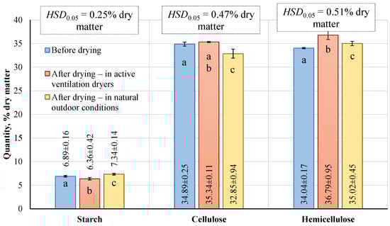 Starch, cellulose, and hemicellulose values in corncob before and after drying. Different lower-case letters indicate significant results at p < 0.05 based on one-way ANOVA with the Tukey HSD test (n = 3). The data are summarized as means ± standard deviations.