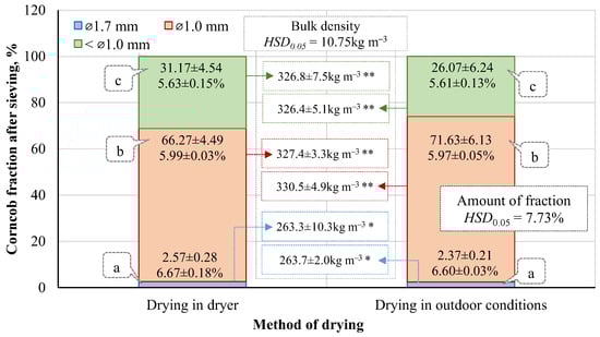 The bulk density of raw corncob before drying was 128.64 kg m−3, after drying it was 153.74 kg m−3, and the bulk density of the milled corncob ranged from 263.3 to 330.5 kg m−3. The lowest bulk density was determined for the <1 mm fraction (in the dryer—263 ± 10.3 and in outdoor conditions—263.7 ± 2.0 kg m−3), with no significant difference between them (p < 0.05, n = 6). No significant difference was also found between the remaining fractions for densities of 1.7 and 1.0 mm.