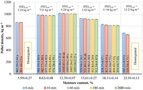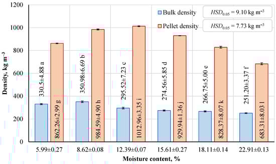 Dependence of corncob moisture on the bulk density and pellet density. Results are significant at p < 0.05 based on one-way ANOVA with the Tukey HSD test between bulk density groups (n = 6) and pellet density groups (n = 5) (lowercase letters). The data are summarized as means ± standard deviations.