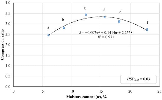 Dependence of the compression ratio on corncob pellet moisture. Results are significant at p < 0.05 based on one-way ANOVA with the Tukey HSD test (n = 5) for differences between groups (denoted by lowercase).