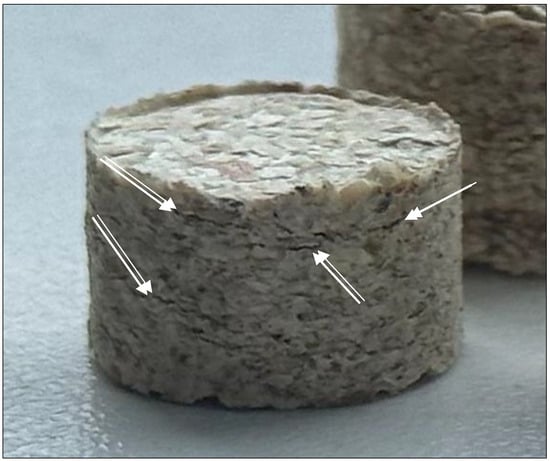After the preparation of the milled 1 mm raw material and moistening to the required moisture content, the density process was applied. The raw material was pressed using an automatic benchtop laboratory ATLAS Autotouch 40T press (Specac Ltd., Orpington, UK). To produce pellets, samples of milled raw material weighing approximately 4 g were transferred into a pressing matrix (diameter 20 mm), which was placed in the press and subjected to a pressing force of 780 MPa (245 kN). The holding time was 15 s. After pressing, the pellet was rapidly removed, and its primary dimensions (height and cross-section) were determined. Measurements were taken immediately after pressing and after 10 min, 1 h, 2 h, 3 h, and 2 days (ambient temperature—16.2 ± 1.1 °C, relative humidity—41.2 ± 2.4%). An electric BMI caliper (0–150 mm) with an accuracy of ±0.01 mm was used. The pellets were evaluated by measuring their height and diameter.