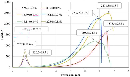 When evaluating the compressive deformation of pellets, which was the highest in 12.39 ± 0.07% moisture pellets, it reached 2471.5 ± 48.5 N. Unlike in the research of other authors, we can note that the analysis of this corncob index was not found. In studies of pellets from Artemisia dubia by Jasinskas et al. [56], when the density of the pellets was 1192.44 kg m−3 and the moisture content was 9.98%, the compressive strength withstood a pressure of 560.36 N. The compressive force of Sida pellets ranged from 557 to 356 N (when the humidity increased from 5% to 15%, the diameter of the pallets was 6.0 ± 0.3 mm) [57]. However, it can be assumed that this indicator was influenced by the size of the pellet under study (the diameter of the pellet ranged from 6.22 to 6.39 mm, and the average pellet length varied from 21.82 to 25.77 mm), since it was produced by a granulator. In the cases of our research, pellets of the same moisture produced by a laboratory press were more uniform (mass of pellets about 4 g, diameter of the pressing matrix—20 mm, pressure force of the laboratory press—780 MPa (245 kN)). The optimal density and diametrical compressive strength of yak manure biofuel pellets are 1502.02 kg m−3 and 0.57 kN at 230 MPa pressure, 6% humidity, and 4.5% binder additive [58].