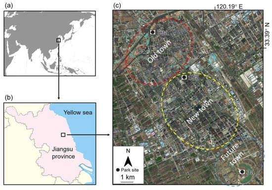 Location of urban park sampling sites in Yancheng, Jiangsu Province, China. (a) Eurasia; (b) Jinangsu Province; (c) Yancheng City.