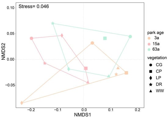 The soil physicochemical properties of urban parks with different vegetation types are shown in Table 1. Among various soil properties, the pH value of soil planted with Cynodon dactylon was higher compared to other soils. AP concentrations in the old park were significantly higher than in the middle-aged and young parks’ soil planted with the same vegetation type. Both vegetation type and park age affected soil SOC, AN, and AK. However, there was no regular trend detected (Table 1). Vegetation type had a significant effect on the catalase and ALP activities (Table 1). The soil planted with Cynodon dactylon and Platanus acerifolia had a higher level of ALP activity, while this level was the lowest in the soil planted with Metasequoia glyptostroboides. Catalase and sucrase activities were at the highest levels in the soil planted with Salix babylonica (p < 0.05). Park ages affected soil sucrase activity, which was at a higher level in the young park’s soil than in the older park’s soil with the same vegetation type (Table 1). Additionally, the stress value of the NMDS was 0.046 < 0.050, suggesting an excellent representation in reduced dimensions (Figure 2). The plots of habitats planted with Salix babylonica were concentrated, as were those planted with Photinia serratifolia. To some degree, the plots gathered together by park age in the graph of NMDS.