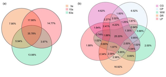 Percentage of operational taxonomic units (OTUs) with different categories in urban parks’ soil samples: (a) urban parks and (b) vegetation types. Notes: 63a, old park; 15a, middle-aged park; 3a, young park; LP, Platanus acerifolia; DR, Metasequoia glyptostroboides; CP, Photinia serratifolia; WW, Salix babylonica; and CG, Cynodon dactylon.