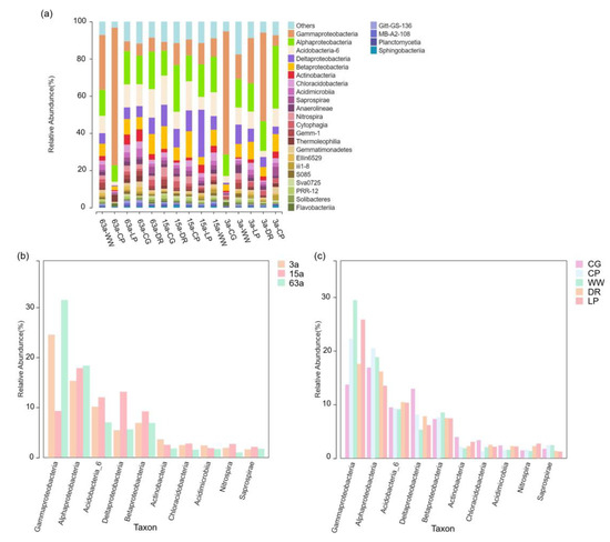 Relative abundances of bacterial community at the phylum level in urban park soils with different vegetation types (a), dominant bacterial community abundance based on urban parks (b), and vegetation types (c). Notes: 63a, old park; 15a, middle-aged park; 3a, young park; LP, Platanus acerifolia; DR, Metasequoia glyptostroboides; CP, Photinia serratifolia; WW, Salix babylonica; and CG, Cynodon dactylon.