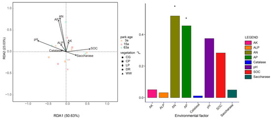 RDA biplot showing the relationship between soil bacterial communities and soil properties (a) and the environmental factors explaining the variations among soil bacterial communities (b). Note: 63a, old park; 15a, middle-aged park; 3a, young park; LP, Platanus acerifolia; DR, Metasequoia glyptostroboides; CP, Photinia serratifolia; WW, Salix babylonica; CG, Cynodon dactylon; ALP, alkaline phosphatase; SOC, soil organic carbon; AN, available nitrogen; AP, available phosphorus; and AK, available potassium. * Means the correlation with p < 0.050.