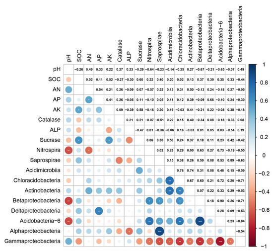 Correlation of soil properties and relative abundance of bacterial communities. Note: the color gradient in the box indicates Pearson’s correlation coefficient, the magnitude of which is proportional to the r-value, and the number indicates the Pearson’s r-value. * p < 0.05, ** p < 0.01, and *** p < 0.001; ALP, alkaline phosphatase; SOC, soil organic carbon; AN, available nitrogen; AP, available phosphorus; and AK, available potassium.
