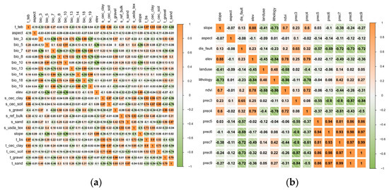Experimental collinearity test of landslide susceptibility evaluation (a) and habitat suitability evaluation of Morinda officinalis (b).