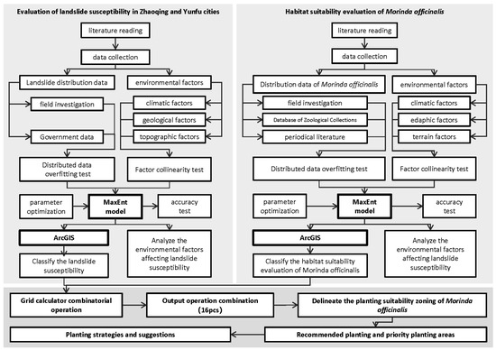 This study comprises two experiments: the analysis of landslide susceptibility in Zhaoqing City and Yunfu City in the Guangdong Province (Experiment 1), and the assessment of habitat suitability for Morinda officinalis (Experiment 2). In experiment 2, particular attention is given to considering the ecological differences present among different populations of Morinda officinalis in order to improve the scientific evaluation of the suitability of habitats for this species. The inclusion of distribution data for Morinda officinalis across China is utilized to evaluate the appropriateness of habitats. Subsequently, the masking extraction tool in ArcGIS is used to extract the results of the habitat suitability assessment based on the scope of the study area. Upon analyzing the results of both experiments, a superposition analysis was conducted to determine the geographic distribution of regions exhibiting high habitat suitability and low susceptibility to landslides for Morinda officinalis. The technical methodology utilized is depicted in Figure 2.