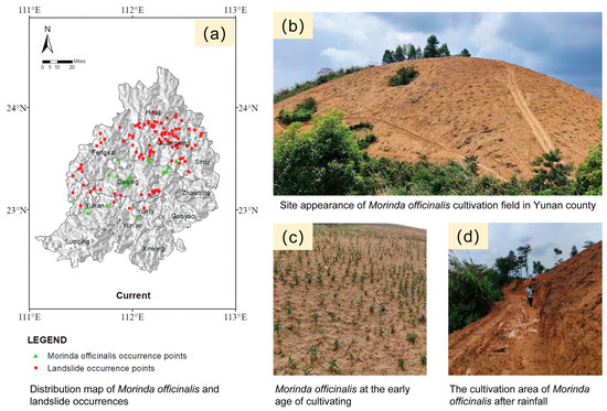 The occurrence points distribution of Morinda officinalis and landslide and the appearance of Morinda officinalis cultivation field. (a) Distribution map of Morinda officinalis and landslide occurrences. (b) Site appearance of Morinda officinalis cultivation field in Yunan county. (c) Morinda officinalis at the early age of cultivating. (d) The cultivation area of Morinda officinalis after rainfall.