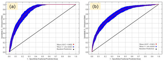 The Receiver Operating Characteristic (ROC) curve functions as a metric for assessing the accuracy of model predictions. The area enclosed by the Receiver Operating Characteristic (ROC) curve and the x-axis is commonly referred to as the Area Under the ROC Curve (AUC) value, which serves as a key indicator of the optimal model accuracy [30]. The Area Under the Curve (AUC) value is a scalar that ranges from 0 to 1. Values closer to 1 suggest higher predictive accuracy [31]. Typically, an AUC value ranging from 0.7 to 0.8 is classified as “relatively accurate”, values between 0.8 and 0.9 are deemed “very accurate”, and those surpassing 0.9 are denoted as “highly accurate” [32].
