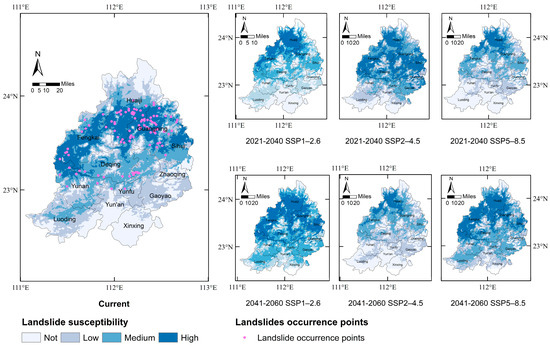 The natural breakpoint method implemented in the ArcGIS software was employed to segment the outcomes of landslide susceptibility produced by MaxEnt (Figure 5). The landslide susceptibility zones in Zhaoqing City and Yunfu City, located in the Guangdong Province, have been categorized into four levels based on the landslide susceptibility index (P): Non-susceptibility area (P < 0.14), low-susceptibility area (0.15 ≤ P ≤ 0.32), medium-susceptibility area (0.33 ≤ P ≤ 0.50), and high-susceptibility area (P > 0.51). According to the data provided in Table 4, the current climate conditions suggest that the areas prone to high landslide susceptibility in Zhaoqing City and Yunfu City, located in the Guangdong Province, cover a total area of 4054 km2. The aforementioned areas are primarily located in the western and north-central regions of the research area, encompassing a substantial portion of the Fengkai County, the southern area of the Huaiji County, the western sector of the Guangning County, the northern vicinity of Sihui City, the northeastern part of the Deqing County, and the northwestern part of Yunfu City. The medium-susceptibility area covers an estimated 5034 km2, mainly concentrated in the central region of the study area, particularly surrounding the Deqing County, Gaoyao District, Huaiji County, Guangning County, and Fengkai County. Moreover, this geographical area encompasses the northwestern region of the Gaoyao District in Zhaoqing City, the eastern area of the Yunnan County in Yunfu City, the central zone of Luoding City, and the northern sector of the Yuncheng District. The areas of low susceptibility and non-susceptibility, totaling approximately 5306 km2, are predominantly located in the northern and southern regions of the research area. These areas are particularly concentrated near the Yun’an District, Yuncheng District, Xinxing County, Gaoyao District, Duanzhou District, and Dinghu District of Zhaoqing City. The distribution of landslide susceptibility within the study area shows a spatial pattern characterized by higher susceptibility in the northern region and lower susceptibility in the southern region. Yunfu City exhibits a lower level of landslide susceptibility in comparison to Zhaoqing.