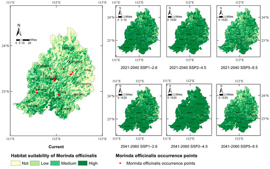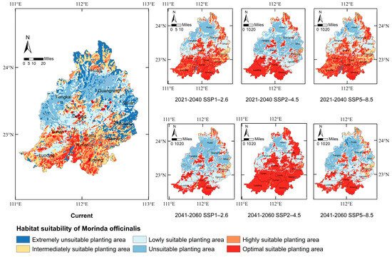 Superimposed spatial distribution map of the highly and optimally suitable cultivating area of Morinda officinalis in the study area under current and 2021–2040 climate conditions.