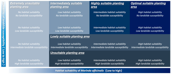 In alignment with the research objectives, the results of the landslide susceptibility and habitat suitability evaluations for Morinda officinaria in Zhaoqing city and Yunfu city, located in the Guangdong Province, were superimposed, yielding a total of 16 combinations. Subsequently, these combinations were stratified into different tiers of cultivating suitability zones for Morinda officinalis within the study area, encompassing a total of six levels (Figure 7). The cultivating regions were categorized into different levels of suitability based on a ranking system ranging from the least to most favorable. These categories included extremely unsuitable, unsuitable, low suitability, moderate suitability, high suitability, and optimal suitability. The delineations were visualized using ArcGIS software, and the results are illustrated in Figure 8.