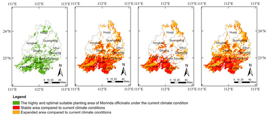 Global warming significantly impacts the distribution patterns of plants and the frequency of meteorological disasters. The research indicates that the average surface temperature is projected to increase by 2.6–4.8 °C by the conclusion of the 21st century [62]. The anticipated increase in temperature is projected to modify the habitat suitability and distribution of landslide susceptibility for Morinda officinalis. Therefore, climate change should be regarded as a pivotal factor. The ongoing progress of the Morinda officinalis cultivation sector in the study region is facing obstacles, highlighting the need for the establishment of a scientifically grounded cultivation zoning map with tangible applications. In consideration of the results outlined in Section 3.5 of this research and given the pressing nature of the issue, the focus is on identifying optimal cultivating locations for the current period and the time span from 2021 to 2040 for further examination. A superposition diagram was generated using ArcGIS software (Figure 10) to depict the spatial distribution of Morinda officinalis and identify the optimal cultivating area in the study region under both current climate conditions and projected conditions for the period 2021–2040. In the diagram, the green color block represents the distribution area of Morinda officinalis and the optimally suitable cultivating area under the prevailing climate conditions. The red color block delineates the stable distribution area of Morinda officinalis at high altitudes and the optimally suitable cultivating area under both current conditions and projected conditions for the period 2021–2040. The yellow color block delineates the newly incorporated region of Morinda officinalis’ highly and optimally suitable cultivating area under different climate models for the timeframe spanning from 2021 to 2040.