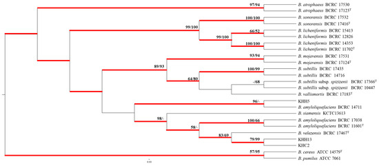 Bayesian analysis tree generated from sequence analysis of the two genes (16s rDNA gene sequences and gyrB gene sequences), which shows the phylogenetic relationships between of Bacillus sp. KHC2, KHH5, and KHH13 and those obtained from NCBI. Bacillus cereus ATCC 14579 was chosen as the out-group. The letter T marks type strains. Branches with Bayesian posterior probabilities (PP) above 95% are printed in red. The support values of maximum likelihood bootstrap (MLB) and maximum parsimony bootstrap (MPB) are given at the nodes (MLB/MPB). Branches with a bootstrap value of less than 50% are marked with a negative sign. The scale bar represents the expected number of changes per nucleotide position.