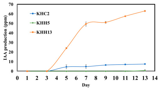 Comparative analysis of indole-3-acetic acid (IAA) production by Bacillus velezensis strains KHC2 and KHH13, and B. amyloliquefaciens KHH5 in Luria-Bertani medium. The IAA production levels of each bacterial strain over a period of 1, 3, 5, 7, 9, 11, and 13 days of incubation.