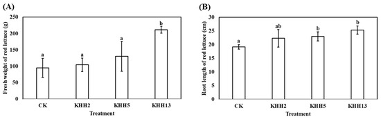 Comparative assessment of plant growth-promoting effects by Bacillus velezensis strains KHC2, KHH13, and B. amyloliquefaciens KHH5 on red lettuce (Lactuca sativa L. cv. LS-006). The fresh weight (A) and root length (B) of the red lettuce were observed and recorded after one month of treatment. Different letters indicate significant difference compared to the blank group (p < 0.05).