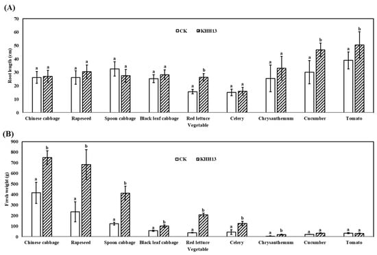 Comparative assessment of plant growth-promoting effects by Bacillus velezensis KHH13 on various vegetable crops, including Chinese cabbage, rapeseed, spoon cabbage, black-leaf cabbage, red lettuce, celery, chrysanthemum, cucumber, and tomato. The root length (A) and fresh weight (B) of these vegetables were observed and recorded after 35 days of treatment. Different letters indicate significant difference compared to the blank group (p < 0.05).