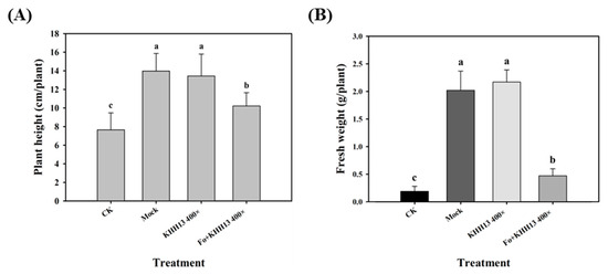 The Impact of Bacillus velezensis KHH13 treatment on the growth of Fusarium wilt-infected cucumber plants. (A) Plant height; (B) fresh weight. CK: Pathogen control group; Mock: Blank control group; KHH13 400×: KHH13 (400 times dilution) non-pathogen control group; Fo + KHH13 400×: KHH13 (400 times dilution) irrigation treatment group. Different letters indicate statistical difference analyzed using the Tukey Honestly Significant Difference (Tukey’s HSD) test at a significance level of 5%.