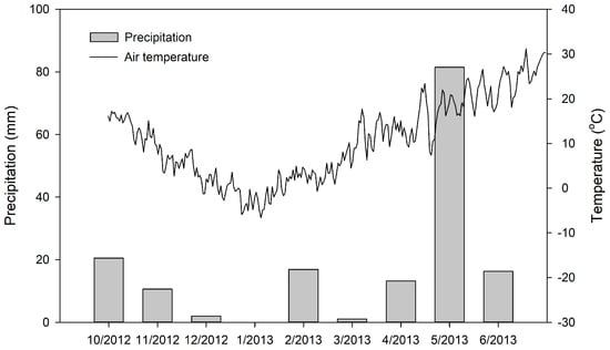 This study was conducted at a long-term field station established in 2004 at the Institute of Soil and Water Conservation of the Chinese Academy of Science. The study area is located at 34° 16′ 56.24″ N and 108° 4′ 7.95″ E (Yangling, China) and has a typical mild and semi-humid climate. Its mean annual precipitation is approximately 612 mm, and its mean annual air temperature is 13 °C. Rainfall is mainly concentrated from July to September. The daily temperatures and monthly rainfalls for 2012–2013 at the study location are shown in Figure 1. The air temperature was measured using a Testo 175-T2 data logger (Testo limited, Alton, UK), and precipitation was measured using a tipping bucket rain gauge (Model 7852, Davis Instruments, Hayward, CA, USA) connected to a CR10X data logger. In terms of annual precipitation and its distribution, 2012–2013 were regular years in this region.