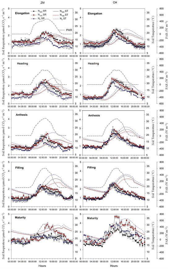 On the seasonal scale, N180 and N360 increased cumulative CO2 effluxes by approximately 30.3% and 32.4%, respectively, and decreased cumulative STs by approximately 5.6% and 6.5%, respectively (Figure 3). The response of cumulative CO2 effluxes did not differ between cultivars, and the cumulative ST responses were greater in CH than in ZM. In addition, the SR and ST showed strong diurnal patterns with peaks in the daytime (Figure 4). N180 increased the daily peak of the SR over the growing season. By contrast, N360 increased the daily peak of the SR only from the elongation stage to the anthesis stage.