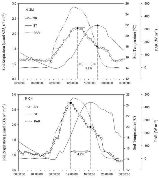The daily peak of the ST delayed the peak of the SR by approximately 5.2 h (varying from 3.0 h to 7.5 h) in the ZM plots and by approximately 4.7 h (varying from 3.5 h to 6.0 h) in the CH plots (Figure 5). Generally, higher SWC and shorter lag times were observed in the CH plots than in the ZM plots (Figure 4).