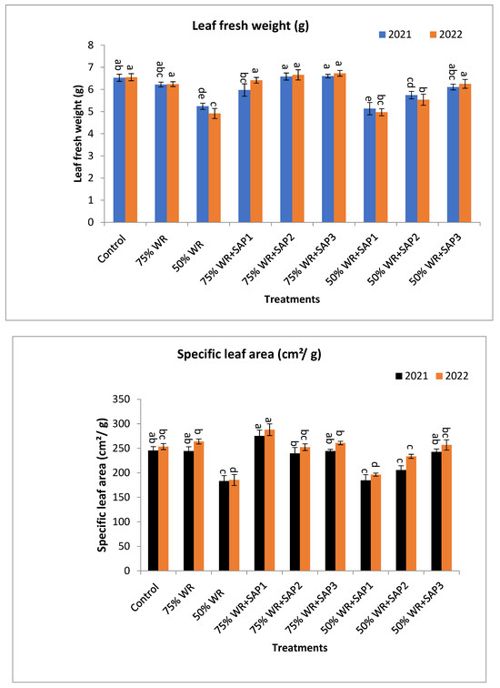 Effect of the combinations of rates of water requirement (WR) and amounts of super-absorbent polymer (SAP) on fresh leaf weight and specific leaf area in green bean plants during 2021 and 2022 seasons. Different letters indicate significant differences between values at p ≤ 0.05 according to Duncan’s multiple range test. Bar represents the standard deviation.